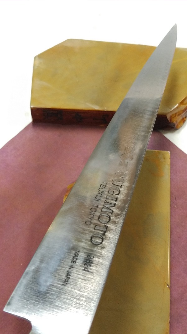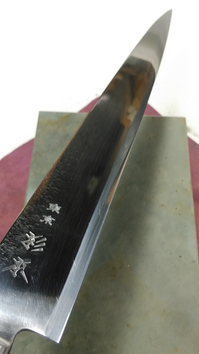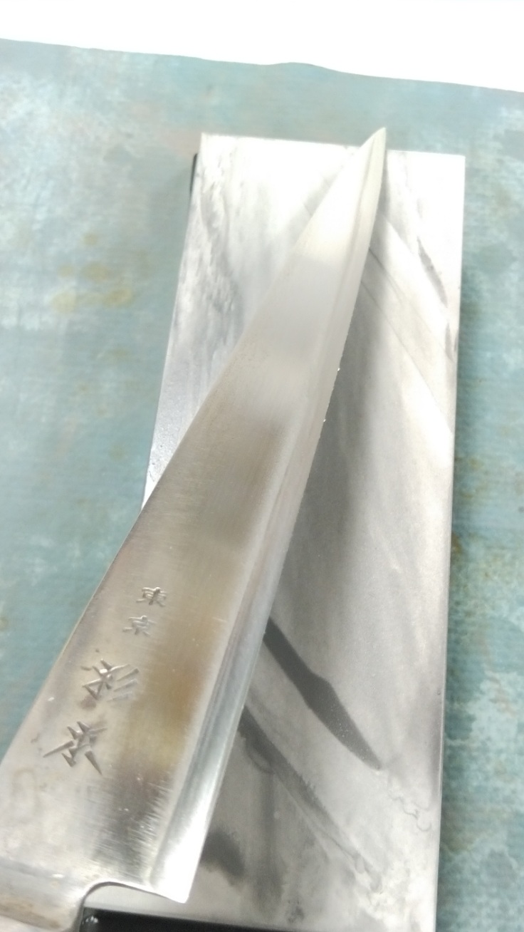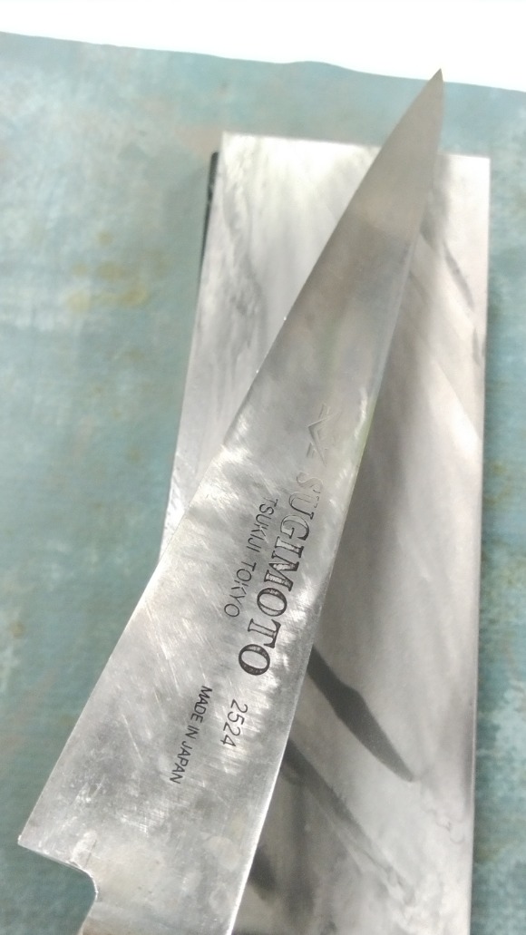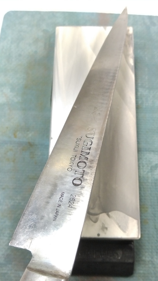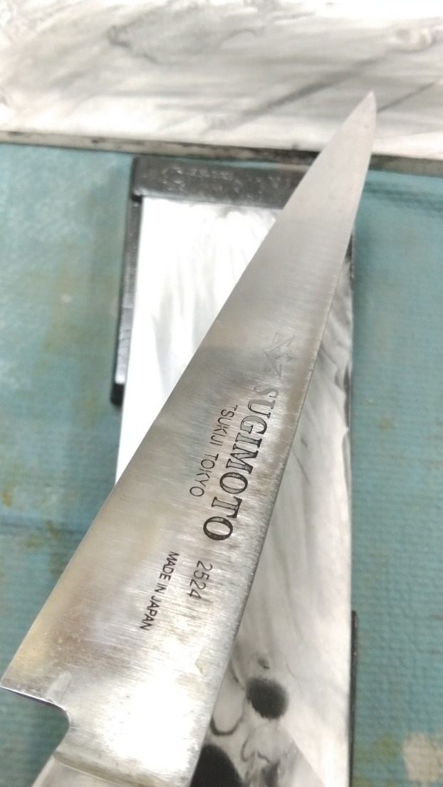 大阪市で、肉関係の店舗のS様から、筋引きを送って頂きました。御要望としては、形状の修正がメインとの事でしたので、刃線を整える事と並行して、刃体の厚みのチェックも行なう事に。