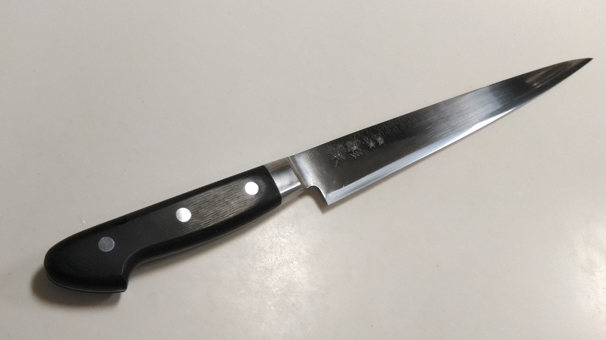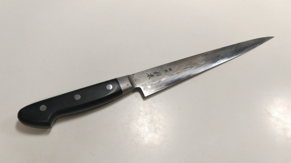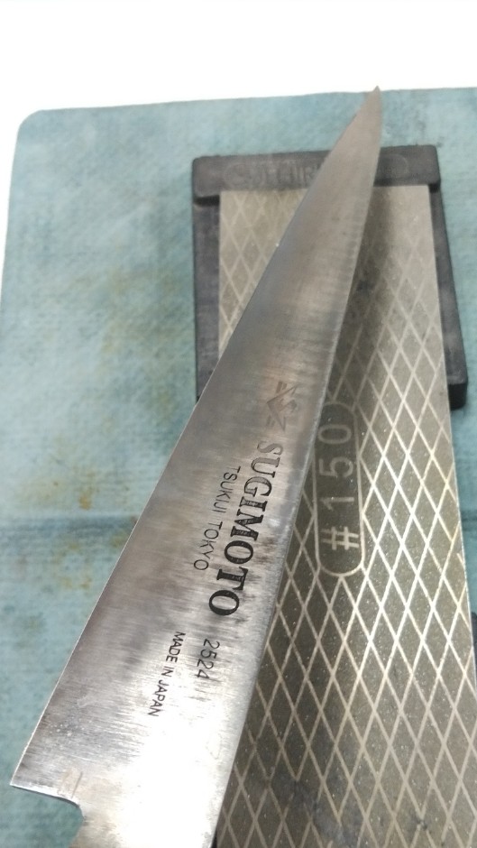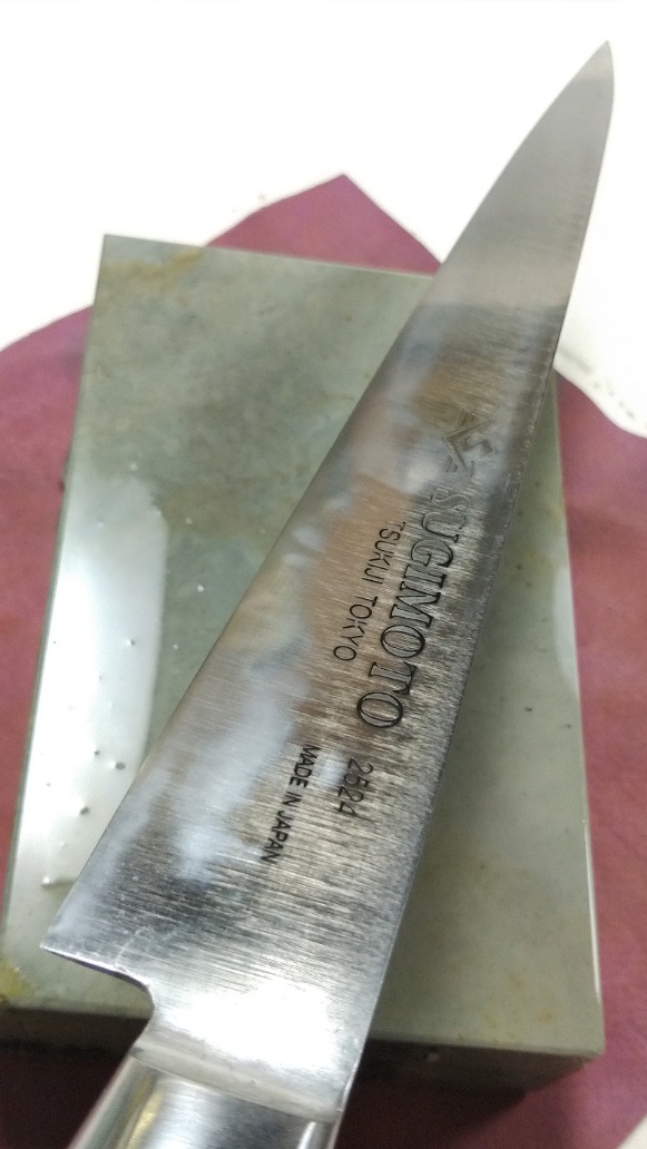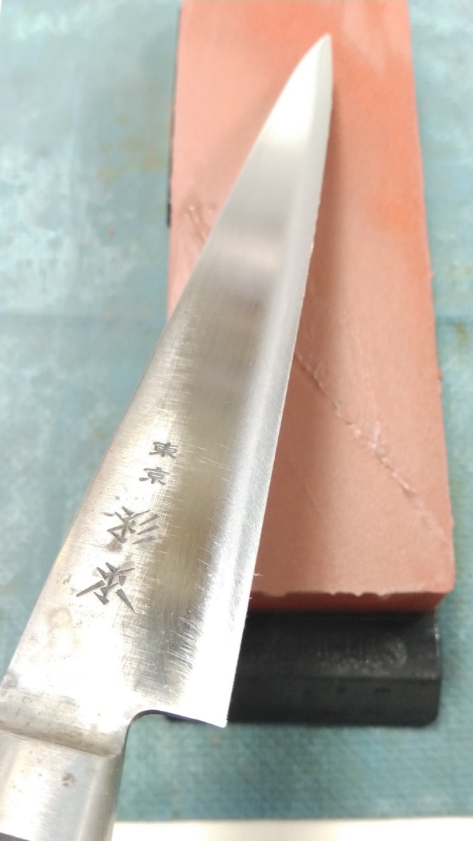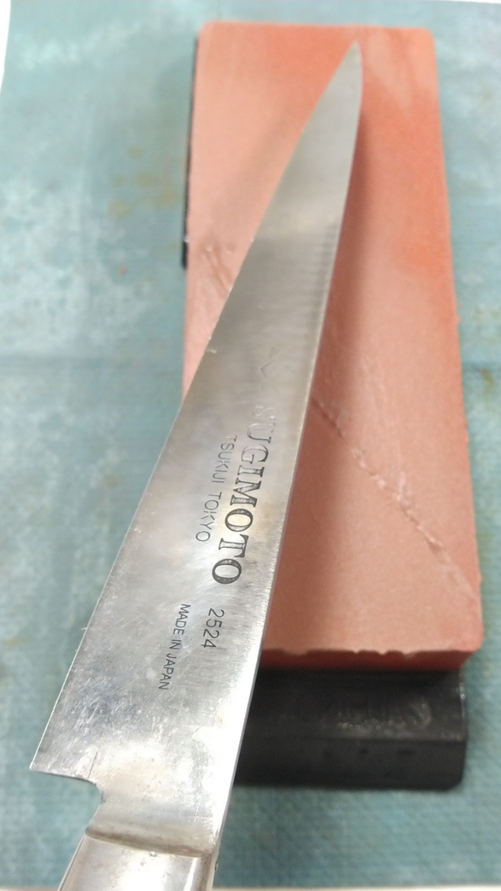 大阪市で、肉関係の店舗のS様から、筋引きを送って頂きました。御要望としては、形状の修正がメインとの事でしたので、刃線を整える事と並行して、刃体の厚みのチェックも行なう事に。
