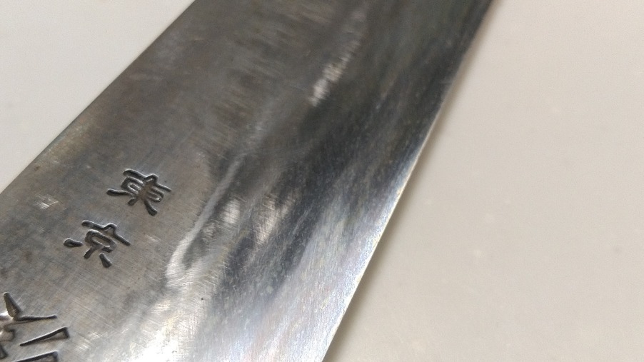 研ぎ前の状態です。片刃(裏梳きは無し)の洋包丁として、切り刃的な研ぎが施されて居ます。刃線間際の薄さは、可成りな物ですので、切れに拘って研がれて居るのが拝察されます。